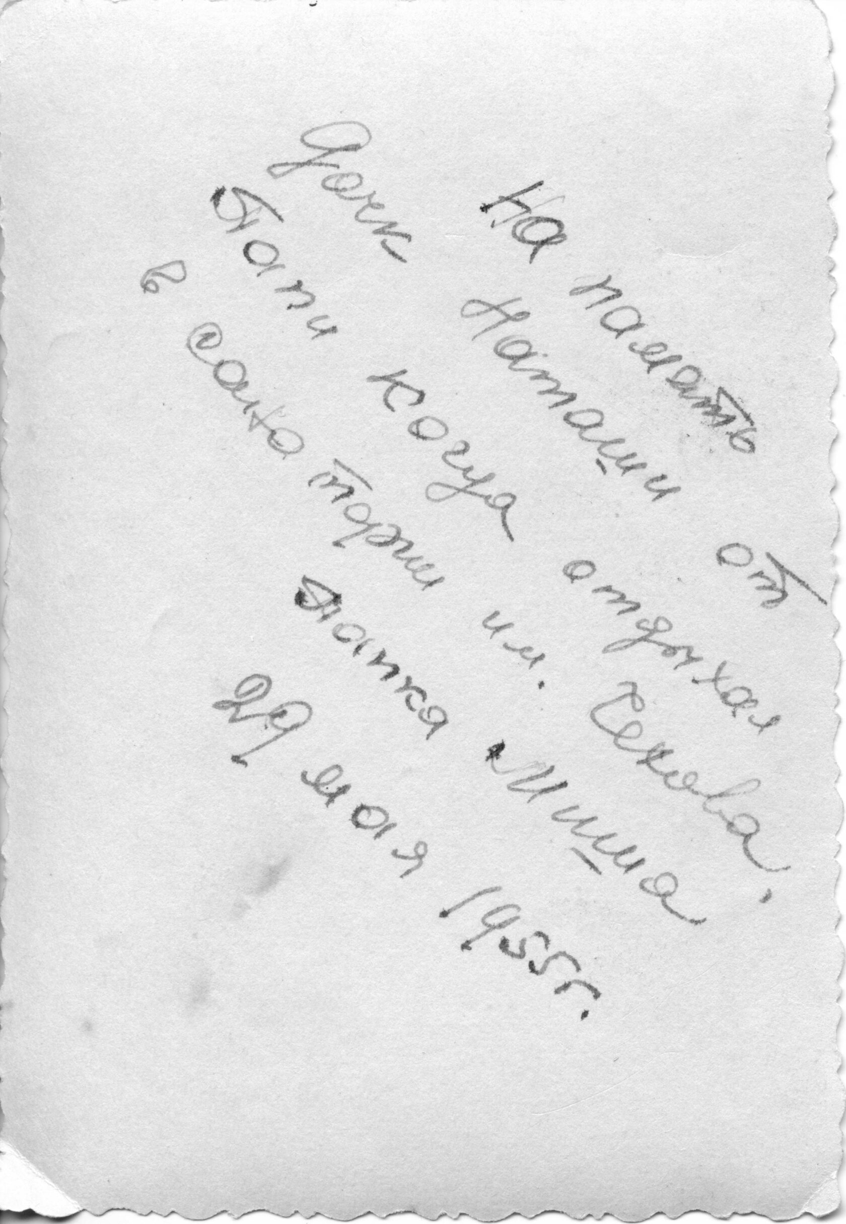 «На память дочк Наташи от Папи когда отдыхал в санатории им. Чехова. Папка Миша 29 мая 1955»
