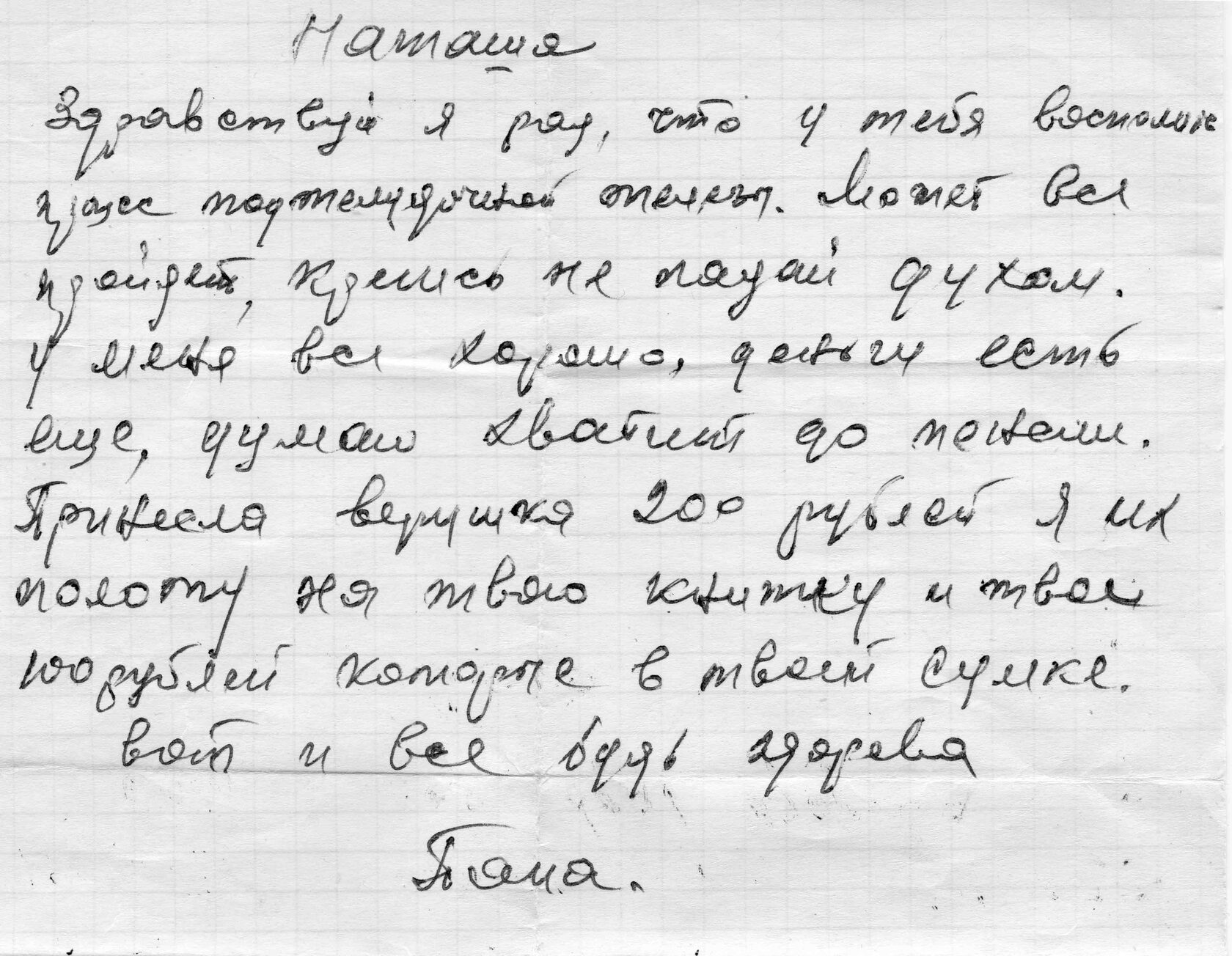 «Наташа Здравствуй я рад, что у тебя восстановительный процесс поджелудочной железы. Может вся пройдет, крепись не падай духом. У меня все хорошо, деньги есть еще, думаю хватит до пенсии. Привезла верушка 200 рублей я их положу на твою книжку и твои 100 рублей которые в твоей сумке. Вот и всё, будь здорова. Папа»
