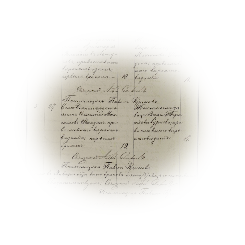 в жены девицу села Биянки – Суркову Веру Терентьевну. Свидетелями венчания по жениху выступили: родной дядя Игната по его отцу – Шалдин Алексей Федотович, а также Парфен и Павел Михайловичи Холоповы. А по невесте свидетелями венчания были родные братья Веры – Сергей и Федор Терентьевичи, а также Федосов Георгий Федорович.